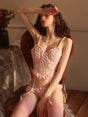 This pink corset lingerie set blends delicate floral lace with pearl accented straps, creating a romantic and feminine look. The structured bodice offers underwire support, while ruffled trims and bow details enhance its charm. Designed with a matching lace panty and adjustable garter straps, this floral corset is perfect for those who love intricate details. A must have lingerie corset that combines elegance and comfort effortlessly.