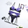 - The lace on the front and the back is absolutely gorgeous,perfectly show your elegant figure. This seductive lingerie sets features sheer lace cups with strappy detailing, satin bow accents, adjustable spaghetti straps, a hook back closure, a matching high waisted garter belt, adjustable garter straps with metal clips, and a matching G-string panty.