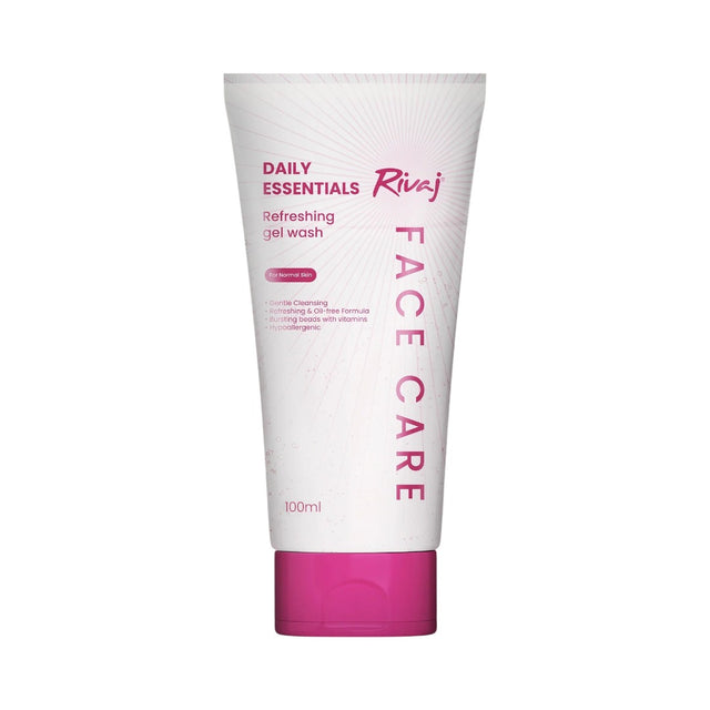 Rivaj Daily Essentials Refreshing Gel Wash boosts skin hydration for soft, supple skin. This mild, easy-to-apply facial cleansing gel transforms into a velvety lather that effectively removes dirt, oil, and bacteria while also lifting makeup without stripping your skin. The mild solution leaves the skin feeling clean and supple to the touch.
