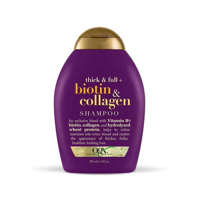 OGX Thick & Full+ Biotin & Collagen Shampoo is an exclusive blend of Vitamin B7 biotin, collagen and hydrolyzed wheat protein that helps thicken and texturize any hair type with just one use. A powerful sulfate-free formula, OGX Thick & Full+ Biotin & Collagen Shampoo helps volumize even the skinniest strands to create an appearance of thicker, fuller and healthier looking hair. OGX beauty pure and simple!