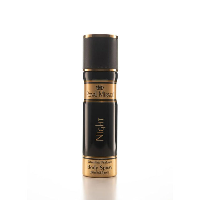 ROYAL MIRAGE - Night Perfumed Body Spray 200ml Experience the perfect blend of enticing fragrance and moisturizing benefits with Royal Mirage Night Perfumed Body Spray 200ml. This luxurious mist is carefully crafted to leave your skin feeling nourished and refreshed all day long.