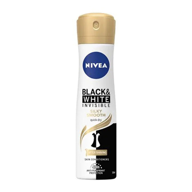 Nivea Black & White invisible Silky Smooth Body Spray For Women 150ml Formula with skin conditioners for silky soft and velvety smooth skin. White mark protection on black clothing & anti-yellow staining on white clothing. Reliable 48h antiperspirant protection that cares for your skin.